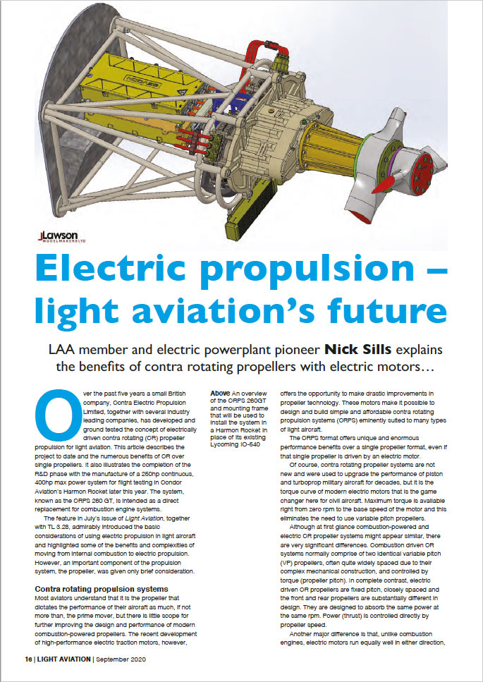 CEP Ltd has published an article entitled “Electric Propulsion - light aviation’s future” in the LAA’s official magazine explaining the application and benefits of electrically powered Contra Rotating Propellers in light aircraft.